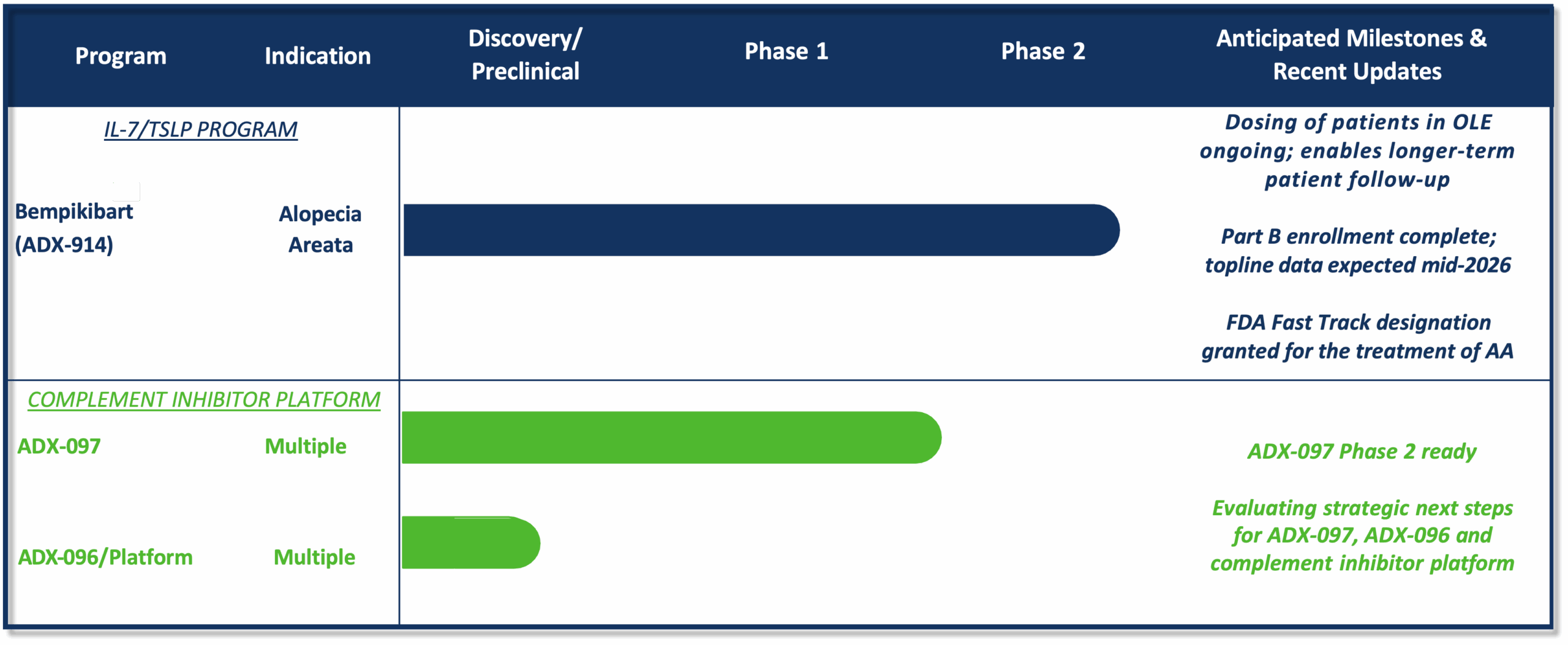 Q32 Bio is currently evaluating strategic options for our Phase 2, tissue-targeted complement inhibitor, ADX-097, and our complement inhibitor platform which includes the development candidate ADX-096, a C3d – CR1 fusion protein, and other earlier stage assets, including C3d mAb fusions and nanobodies designed for tissue-targeted complement inhibition. Q32 Bio has developed a novel discovery platform that is enabling the advancement of tissue-targeted complement inhibitors which have potential therapeutic activity across the numerous diseases in which C3 complement fragments are deposited in diseased tissue. ADX-097 has the potential for the treatment of renal and other complement-mediated diseases of high unmet need, including lupus nephritis (LN), IgA nephropathy (IgAN), and C3 glomerulopathy (C3G).